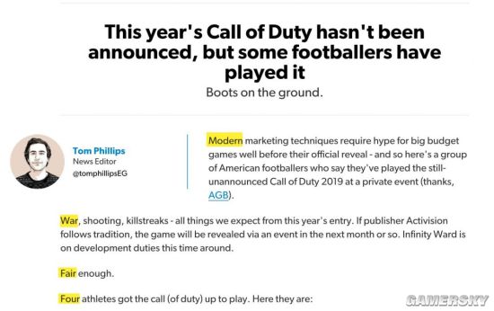 另外,外媒Eurogamer在报道此事时,文章开头四段的首个单词连起来是“Modern War Fair Four”,要说这纯粹是巧合估计也没人会相信。这一细节被网友发现后,还得到了Eurogamer的转发,疑似盖章大家对《使命召唤》新作为“现代战争4”的猜测。