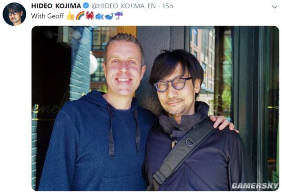 饭局过后,小岛秀夫与Geoff Keighley亲密合影,并配上了大赞、彩虹、螃蟹、鱼、鲸鱼、雨伞表情。
