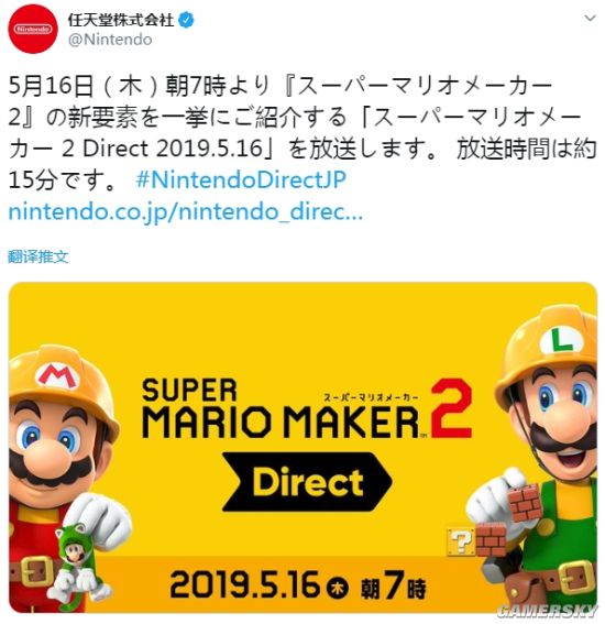 任天堂官方发推宣布,他们将在北京时间5月16日早上6点为《超级马里奥制造2》举办时长15分钟的直面会,介绍本作带来的新元素。